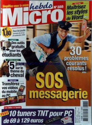 ![MICRO HEBDO [No 388] du 22/09/2005 - MAITRISEZ LES STYLES DE WORD - DES OUTILS GRATUITS POUR LES ETUDIANTS - 5 JEUX SUR LE THEME DU CHEVAL - S.O.S. MESSAGERIE - TRANSFEREZ VOS VIDEOS DU MOBILE AU PC - 10 TUNERS TNT POUR PC. francais MICRO HEBDO [No 388] du 22/09/2005 - MAITRISEZ LES STYLES DE WORD - DES OUTILS GRATUITS POUR LES ETUDIANTS - 5 JEUX SUR LE THEME DU CHEVAL - S.O.S. MESSAGERIE - TRANSFEREZ VOS VIDEOS DU MOBILE AU PC - 10 TUNERS TNT POUR PC. francais](https://images-eu.ssl-images-amazon.com/images/I/51-vbfP7W3L.jpg)